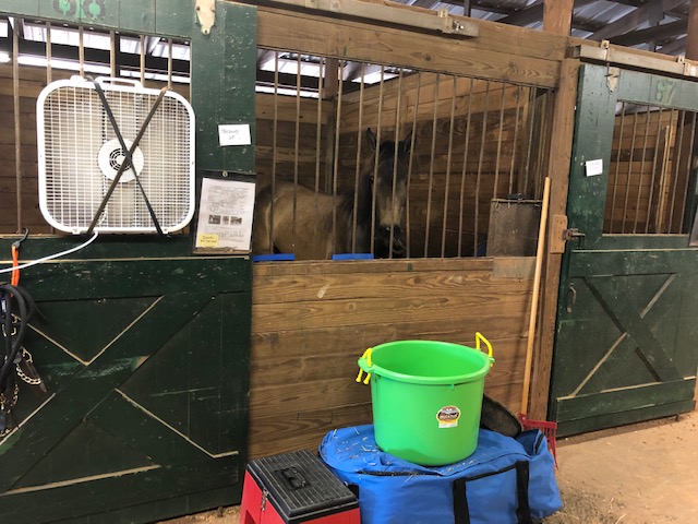 When the time came to head to the show grounds, I was too nervous to drive. Hubby said he'd drive, I could follow in my car and he'd drive it home. We got Joker set up in his stall. Hubs found a spot in the shade to park my home away from home. Not terribly close to Joker or to the bathroom/showers on the grounds, but shade was a priority if it was going to be that hot. Got some of my stuff unpacked. Walked Joker around a bit to let him see things. Got a bite to eat. Hubby left to go home and take care of the animals and said he'd be back in the morning to watch us. So it was me and Joker, left alone....